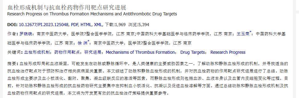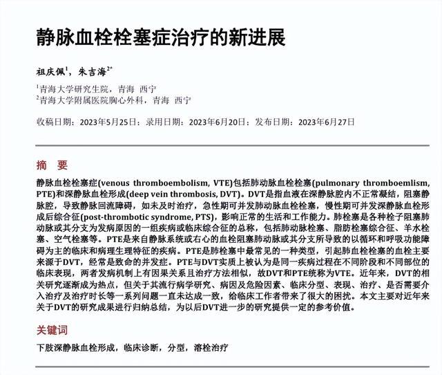 祖庆佩, 朱吉海. 静脉血栓栓塞症治疗的新进展[J]. 临床医学进展, 2023, 13(6): 10081-10087.